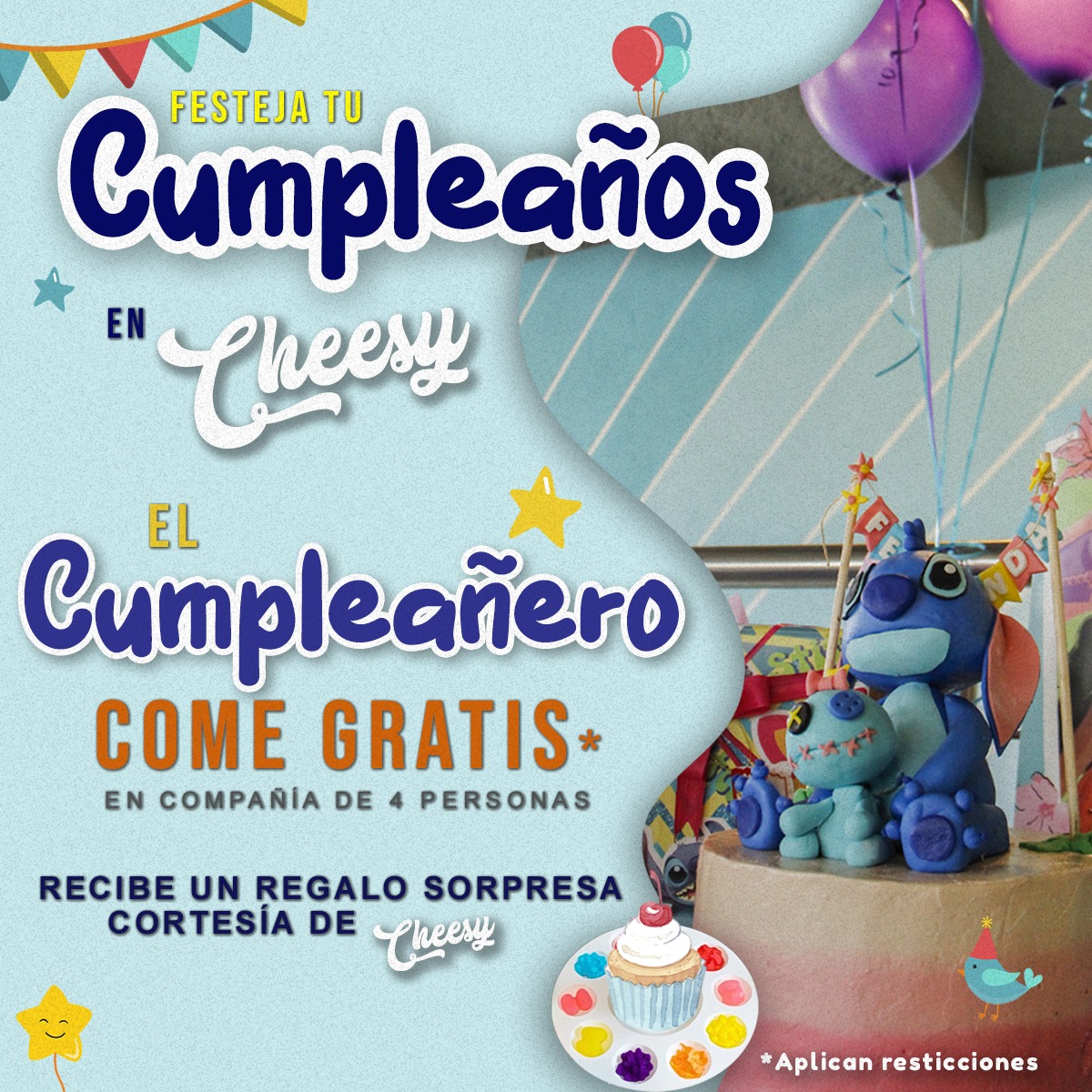 La promoción no incluye bebidas ni extras, aplica dentro de la semana del cumpleaños y necesitamos alguna identificación o curp en caso de ser menor de edad. No aplica con otras promociones.